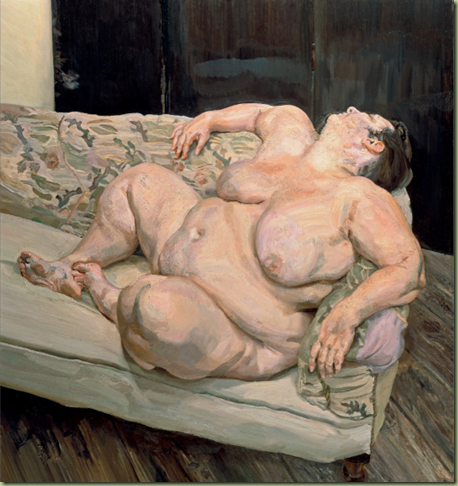 Freud wordt ook wel gezien als een exponent van het existentialisme, de geschilderde modellen lijken niet echt aanwezig, hebben een blik die vooral naar binnen gericht is. De kijkrichting is meestal naar een punt buiten het schilderij. De naakten zijn vaak in een zeer exposerende positie afgebeeld, de geslachtsdelen vragen prominent de aandacht. Het werk wordt daarom soms confronterend gevonden.